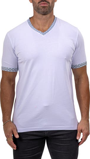 Patterned accents frame the neckline and cuffs of an all-cotton T-shirt designed in a versatile solid with V-neck construction and an athletic, physique-hugging fit. Finished with a straight hem that looks best when you leave it untucked, it makes a versatile wardrobe staple that lets you go sporty or casual depending on your mood or the occasion.