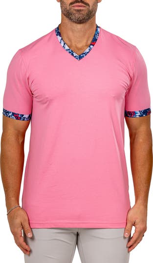 Patterned accents frame the neckline and cuffs of an all-cotton T-shirt designed in a versatile solid with V-neck construction and an athletic, physique-hugging fit. Finished with a straight hem that looks best when you leave it untucked, it makes a versatile wardrobe staple that lets you go sporty or casual depending on your mood or the occasion.
