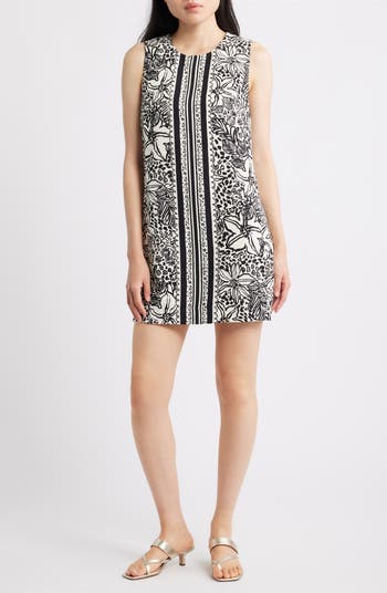 Look chic anywhere in this short little shift dress featuring a tropical woodblock print and a gilded flower zipper pull to finish the look.