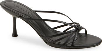 Elevate your party or evening-out look with this leather slide sandal featuring a knotted strappy profile lifted on a flared, sculptural heel.
