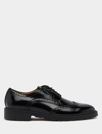 This Eduard derby is constructed in black calfskin that has been brushed for a semi-shiny look and enriched with classic brogue openwork. A chunky rubber sole brings a modern touch to this lace-up style.