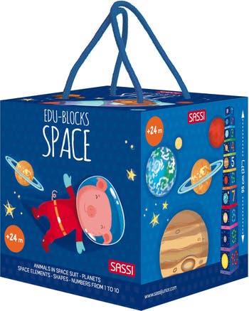 SASSI: EDU BLOCKS - SPACE - Embark on an exciting educational journey with this captivating set of 10 stacking blocks, designed to introduce young learners to a world of exploration and discovery. These sturdy, high-quality cubes not only offer endless fun but also play a vital role in developing essential cognitive and motor skills in children. With each block carefully illustrated with vibrant, engaging designs, including 10 adorable animals and elements from nature, young minds will learn as they play. Standing at an impressive height of nearly one meter (37.4"/95 cm) when stacked, these blocks provide a fun and interactive experience that stimulates creativity and problem-solving. Alongside the blocks, a colorful 10-page mini booklet (measuring 5.12" x 5.12"/13 x 13 cm) introduces children to the wonderful animals featured on each block. From playful creatures like lions and elephants to serene nature elements, the booklet enhances the learning experience with simple, easy-to-understand text. As children build their towering structure and interact with each block, they will not only learn to identify different animals, but also begin to explore key concepts like shapes, colors, and numbers from 1 to 10. The process of stacking and sorting these cubes offers young learners an opportunity to build their hand-eye coordination, strengthen their fine motor skills, and develop spatial awareness. This hands-on approach to learning encourages children to connect concepts with visuals, while helping to reinforce their vocabulary and early math skills.