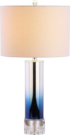 A decorative cutout center column is enclosed in an ombre rose-colored glass effect in this stylish contemporary table lamp. With an elegant, round crystal pedestal base, and topped with a drum shade in white linen fabric, every design detail from finial to plug has been considered for maximum style. Fashion meets function also -- this lamp is compatible with LED, CFL, and Incandescent bulbs.