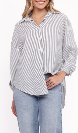 Dropped shoulders enhance the relaxed silhouette of this longline shirt covered in polished stripes and finished with a high/low shirttail hem.