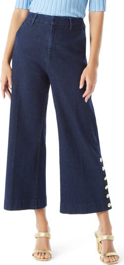 Button-trimmed hems detail stretch-denim jeans featuring a high waist and cropped wide legs.