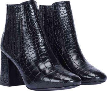 Hidden goring panels offer comfortable wear on a streamlined Chelsea boot shaped from croc-embossed leather and lofted by a wrapped block heel.