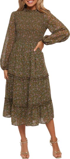 Feel fresh and free in this long-sleeve midi dress patterned in dainty blooms and designed with a smocked bodice and a flowy skirt that has ruffled tiers.