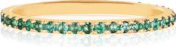 Glimmering green emeralds ring a delicate, stackable eternity band crafted in 14-karat gold.