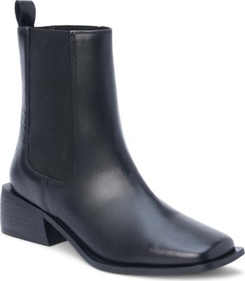 A squared-off toe and sculptural, stacked heel bring sharp angles and walkable height to a leather Chelsea boot featuring a cushioned footbed for added comfort.