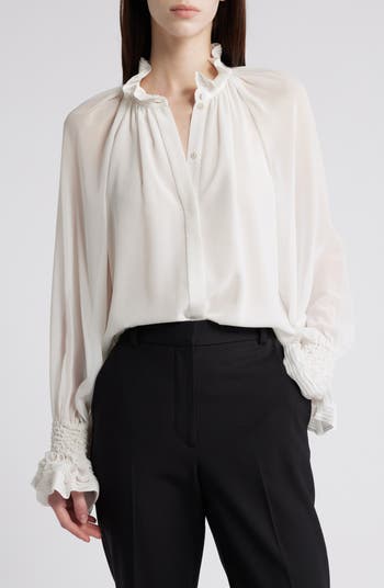 Cut from frothy chiffon and refined with shirred details, this graceful top will be worn from work days to evenings out.