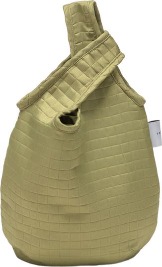 Egg shaped, bound finish, textural grid wristlet tote. Feels like: slightly structured, plush and textural 100% Polyester | Dry clean Only Made in Vancouver, Canada. One Size