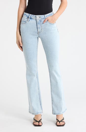 Made from icy-blue stretch denim, these full-length jeans fit close through the thighs before breaking into swishy, '70s-inspired flares at the knees.