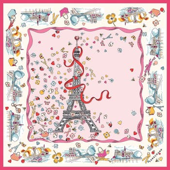 The magnificent Eiffel Tower shines on the background of a starry night with Paris shops lining the border on this square bandana crafted from luxurious silk.