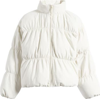 A gathered effect switches up the style for an essential puffer jacket designed to skim the waist.