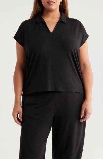 A retro johnny collar shapes the neckline of a boxy top imbued with polished style and cut from sustainable, body-skimming jersey.