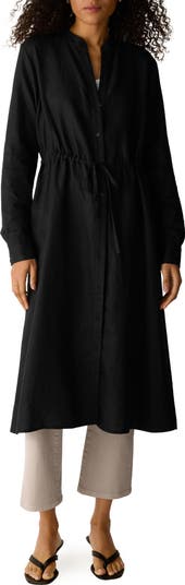 A mandarin collar tops a lovely and lightweight shirtdress crafted from breathable, organic linen and fashioned with a cinching drawstring at the waist.