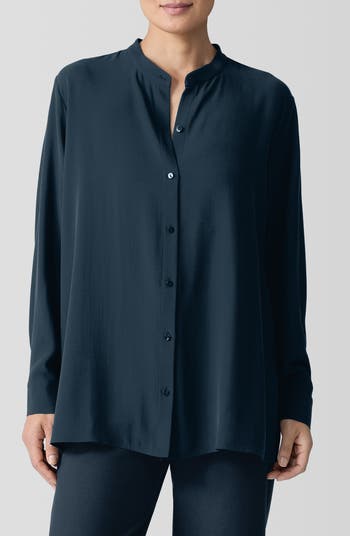 Silk georgette lends luxurious softness to this easy-fitting button-up shirt topped with a mandarin collar.