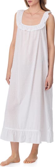 Fuzzy Swiss dots and lace trim bring dreamy texture to this flowy cotton nightgown shaped by a ruffled overlay and vertical pintucking details.