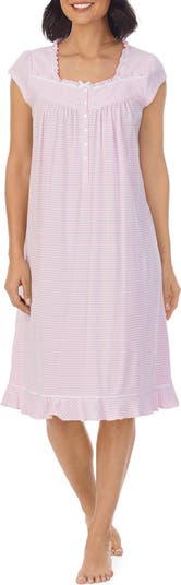 Sweet pink stripes pattern an ultrasoft nightgown finished with the daintiest ruffles and pintucks at the bodice.