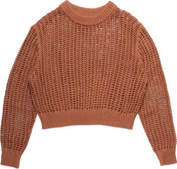 An airy, open stitch lends season-spanning breeziness to a cropped crewneck sweater knit from a cotton-forward blend.