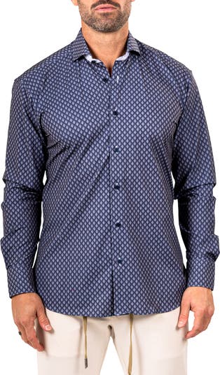 Take your everyday look to the next level in this sport shirt made from a stretchy nylon blend in a fit that's right in between trim and regular.