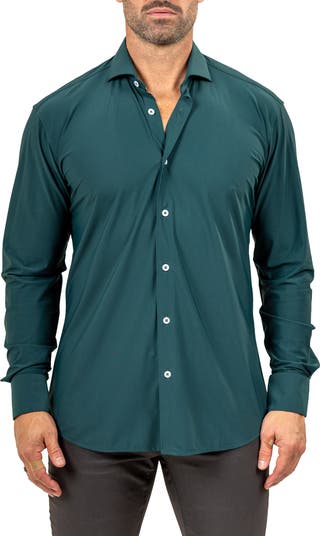 Take your everyday look to the next level in this sport shirt made from a stretchy woven in a fit that's right in between trim and regular.