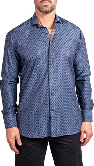 Turn heads in this eye-catching sport shirt made from breathable, subtly lustrous cotton in a fit that's right in between trim and regular.
