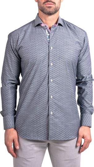 Pops of contrast hiding in the collar and placket bring unexpected energy to a shirt tailored from geo-patterned cotton in a physique-hugging fit that still gives you room to move in comfort. The lower hem stays tucked if you want and looks great when you leave it out.