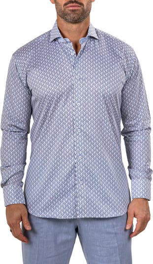 Turn heads in this eye-catching sport shirt made from stretchy, breathable Italian cotton in a fit that's in between trim and regular.