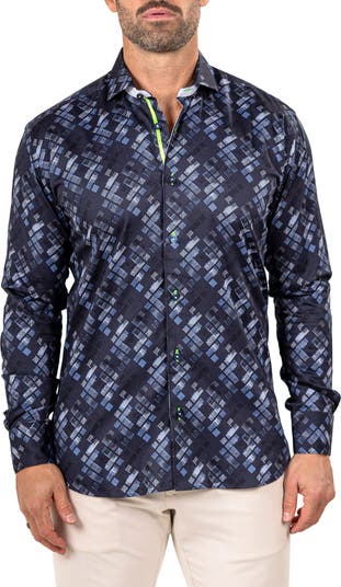 Turn heads in this eye-catching sport shirt made from stretchy, breathable Italian cotton in a fit that's in between trim and regular.