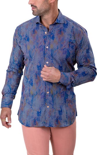 Turn heads in the eye-catching print of this button-up shirt tailored from cotton-enriched fabric in a fit that's right in between trim and regular.