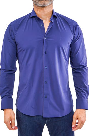 Look as fresh as you feel in this trim-fitting sport shirt made from stretchy, moisture-wicking fabric in a versatile solid hue.