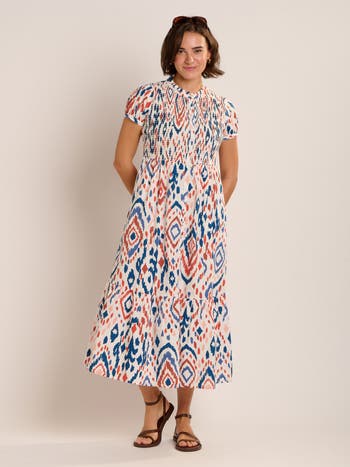 Returning this season is our Erini Maxi Dress crafted from 100% soft cotton with our in-house Sunrise Ikat print. A ruffled neckline and button front are complemented by a shirred bodice create a neat fit. Short sleeves with button cuffs and a tiered maxi-length skirt complete the look. A standout summer style that shows off a sun-kissed glow beautifully.