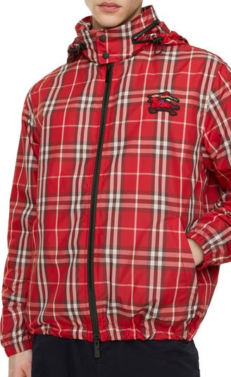 A lightweight jacket with a packaway hood, woven with the Burberry Check in seasonal crayon red. Created as part of our Year of the Horse capsule, the style is appliquéd with an Equestrian Knight Design playfully reimagining our house code in textural and metallic threads.||Press-stud and two-way zip closure|Packaway drawcord hood|Drawcord hem|Side zip pockets|Elasticated cuffs|Comes with a garment bag