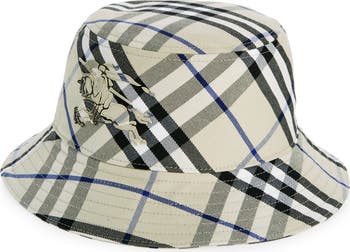 A segmented EKD appliqué camouflages itself against Burberry's iconic check pattern woven into this twill bucket hat.