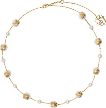 An adjustable chain-link necklace made in Italy from brass with gold plating. The slender style features our B charm and freshwater pearls decorated with the Equestrian Knight Design. Please note, due to natural formation each freshwater pearl is one of a kind and may vary from the item photographed. ||Clasp closure|B-shaped charm|Comes with a dust bag