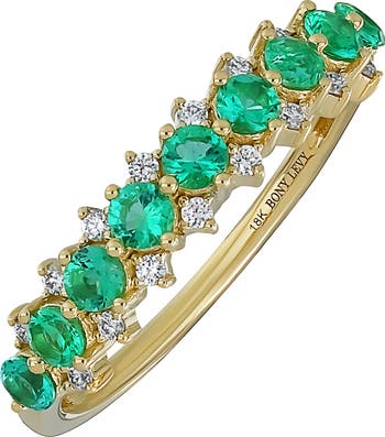 Round emeralds interspersed with fiery diamonds offer rich color and eye-catching sparkle in this stackable, handcrafted 18-karat-gold band.