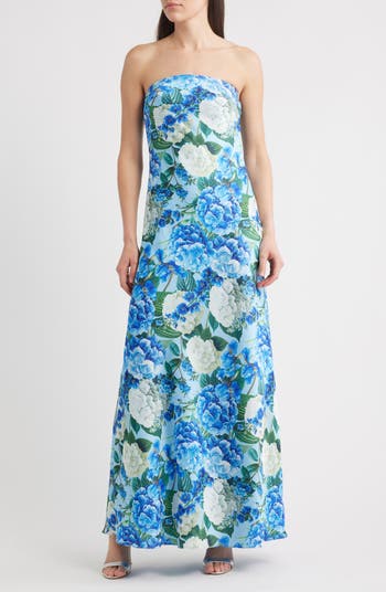 Bring the garden to the party in a winsome, floor-sweeping gown covered in gorgeously realistic blooms and cut in a shoulder-baring silhouette.