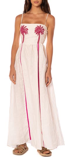 Vibrant palm tree embroidery runs from the neckline of this breezy cover-up dress down to the hem for an elongating effect. The airy, lightweight linen adds playful movement for sunlit afternoons and warm nights.