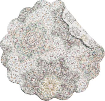 The Elaina table linen collection features a traditional medallion design in a modern grey color palette, bringing timeless style to any kitchen. This quilted cotton placemat is machine washable and reverses to a coordinating small medallion design for another versatile styling option.