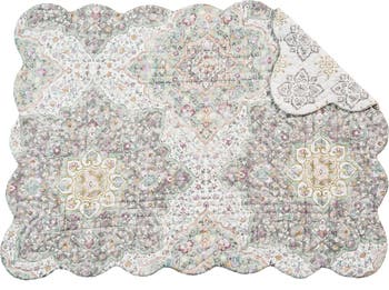 The Elaina table linen collection features a traditional medallion design in a modern grey color palette, bringing timeless style to any kitchen. This quilted cotton placemat is machine washable and reverses to a coordinating small medallion design for another versatile styling option.