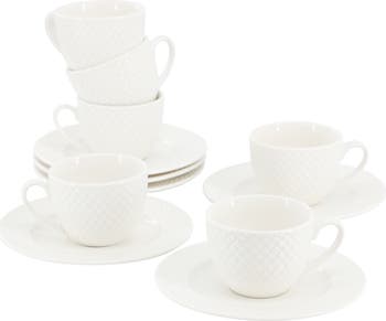 The Elama Sol 12 Piece 3 Ounce Espresso Cup with Saucer Set in White offers a stylish and functional way to enjoy your favorite espresso or coffee beverages. Made from durable porcelain, these cups are designed to withstand daily use while maintaining their elegant look. Each cup features a beautifully textured diamond pattern, adding a touch of sophistication to your coffee routine. The set includes matching saucers, perfect for catching drips and enhancing the presentation of your espresso, making it ideal for both casual mornings and special occasions.In addition to its timeless design, this espresso cup set is both dishwasher and microwave safe, ensuring easy cleaning and convenient reheating without any hassle. The 3-ounce capacity is perfect for serving strong, rich espresso shots, while the sturdy porcelain construction ensures heat retention, keeping your drink at the perfect temperature. Whether you're enjoying a quiet morning or entertaining guests, the Elama Sol Espresso Cup Set provides the perfect blend of beauty and practicality for your coffee experience.