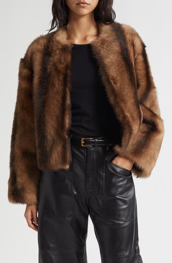 Make a sleek cold-weather statement in a lustrous genuine-shearling jacket cut in a contemporary cropped silhouette.