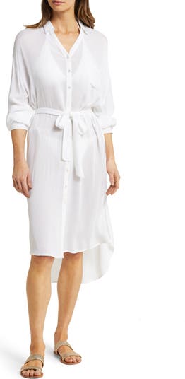 A tie belt wraps around the waist of this breezy long-sleeve shirtdress featuring dropped shoulders for a more casual feel.