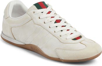 House-signature red-and-green striped webbing brings a Gucci heritage touch to this low-top sneaker made in a sleek silhouette from washed-effect leather.