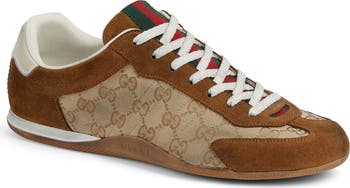 Gucci house codes define this low-profile sneaker that layers supple suede and GG Supreme canvas and features signature striped webbing down the tongue.