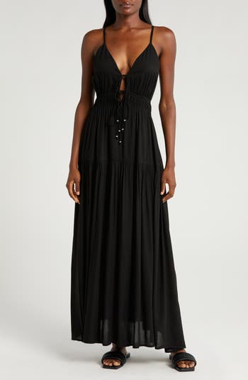 If you must leave your pool chaise, get your groove going with a tiered and tied cover-up dress cut to a maxi length.