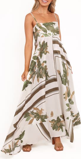 Cut from glossy skin-skimming satin, this flowy maxi is made with an enchanting print and accented with back smocking for shape and comfort.