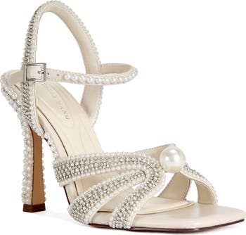 Make your next occasion extra special with this lofty ankle-strap sandal covered in sparkling crystals and pearly beads.