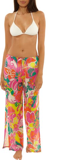 Bring eye-catching style and playful color to your poolside look with breezy cover-up pants featuring an elastic waist and a soaring slit at each side.